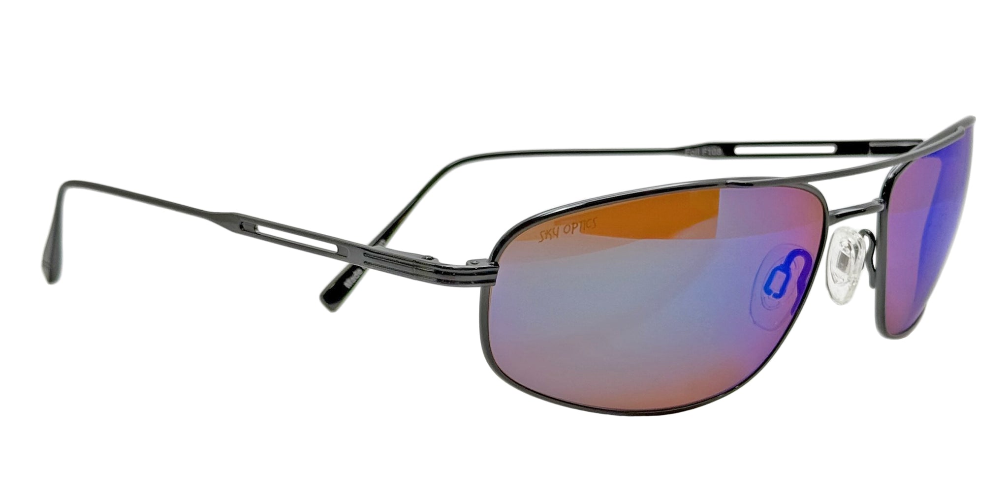 Sky Optics Foil Sunglasses. Light-weight titanium frame with mineral glass lenses. Great balance, soft silicone gel nose pads for a more comfortable fit and better nose grip and thin flexible temple arms that works great with all headsets and helmets.