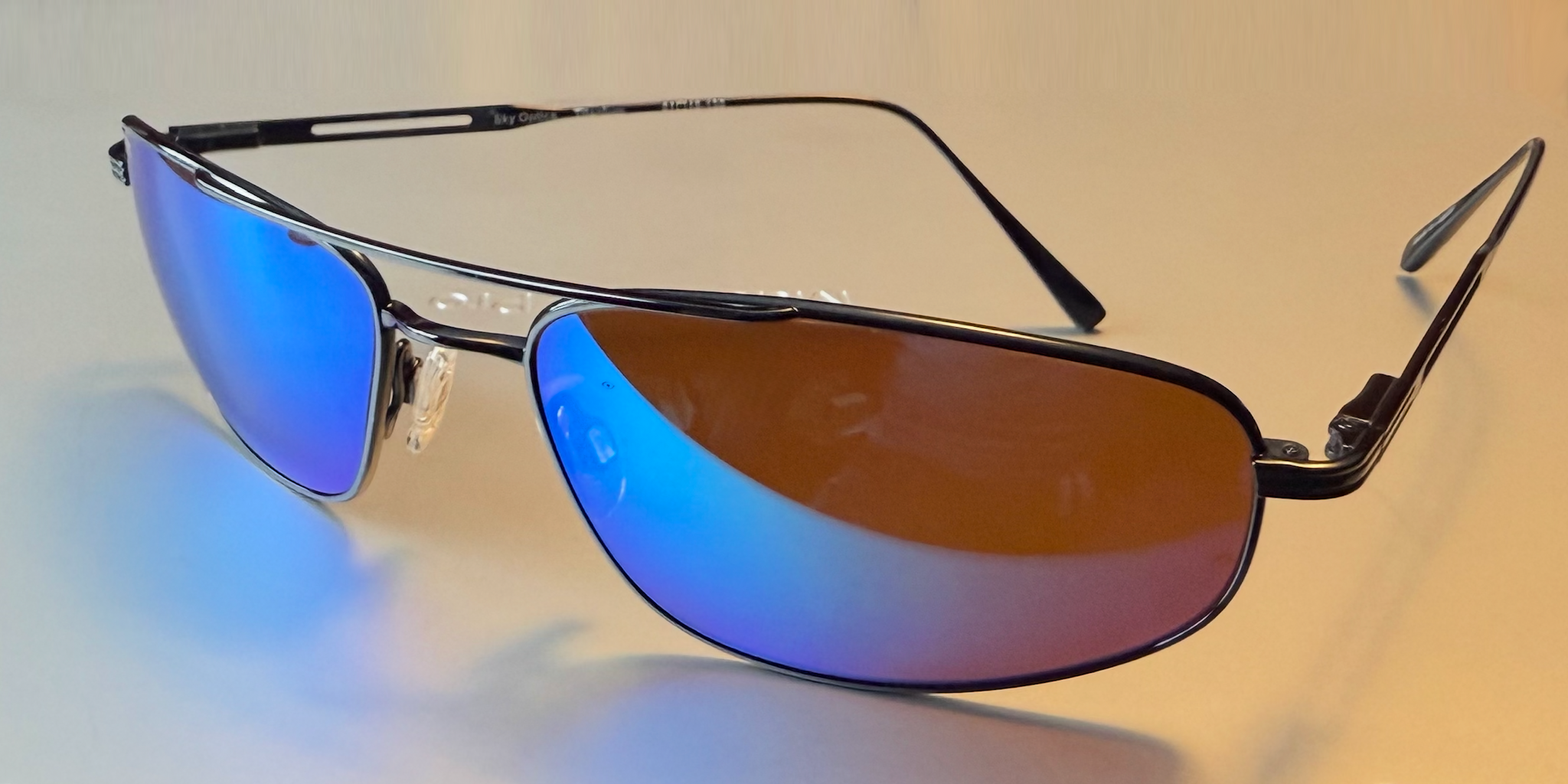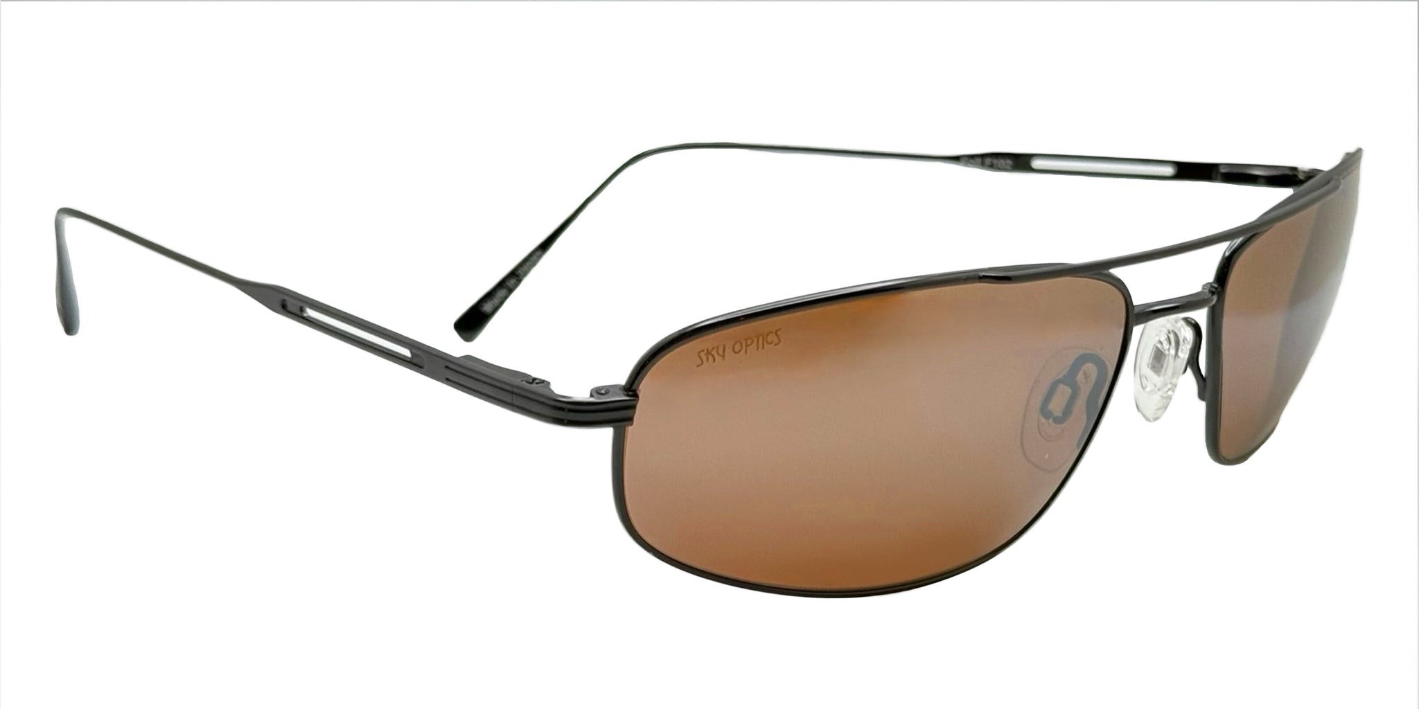 Sky Optics Foil Sunglasses. Light-weight titanium frame with mineral glass lenses. Great balance, soft silicone gel nose pads for a more comfortable fit and better nose grip and thin flexible temple arms that works great with all headsets and helmets.