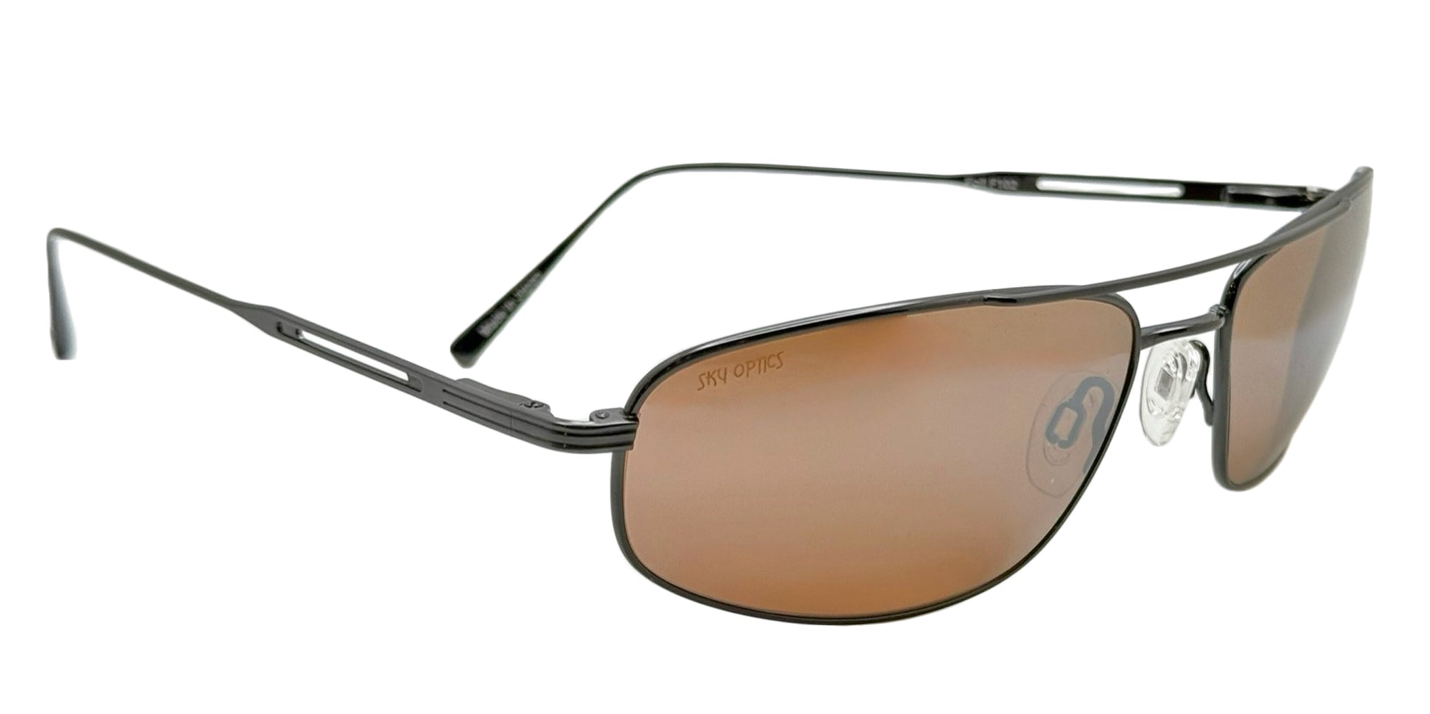 Sky Optics Foil Sunglasses. Light-weight titanium frame with mineral glass lenses. Great balance, soft silicone gel nose pads for a more comfortable fit and better nose grip and thin flexible temple arms that works great with all headsets and helmets.