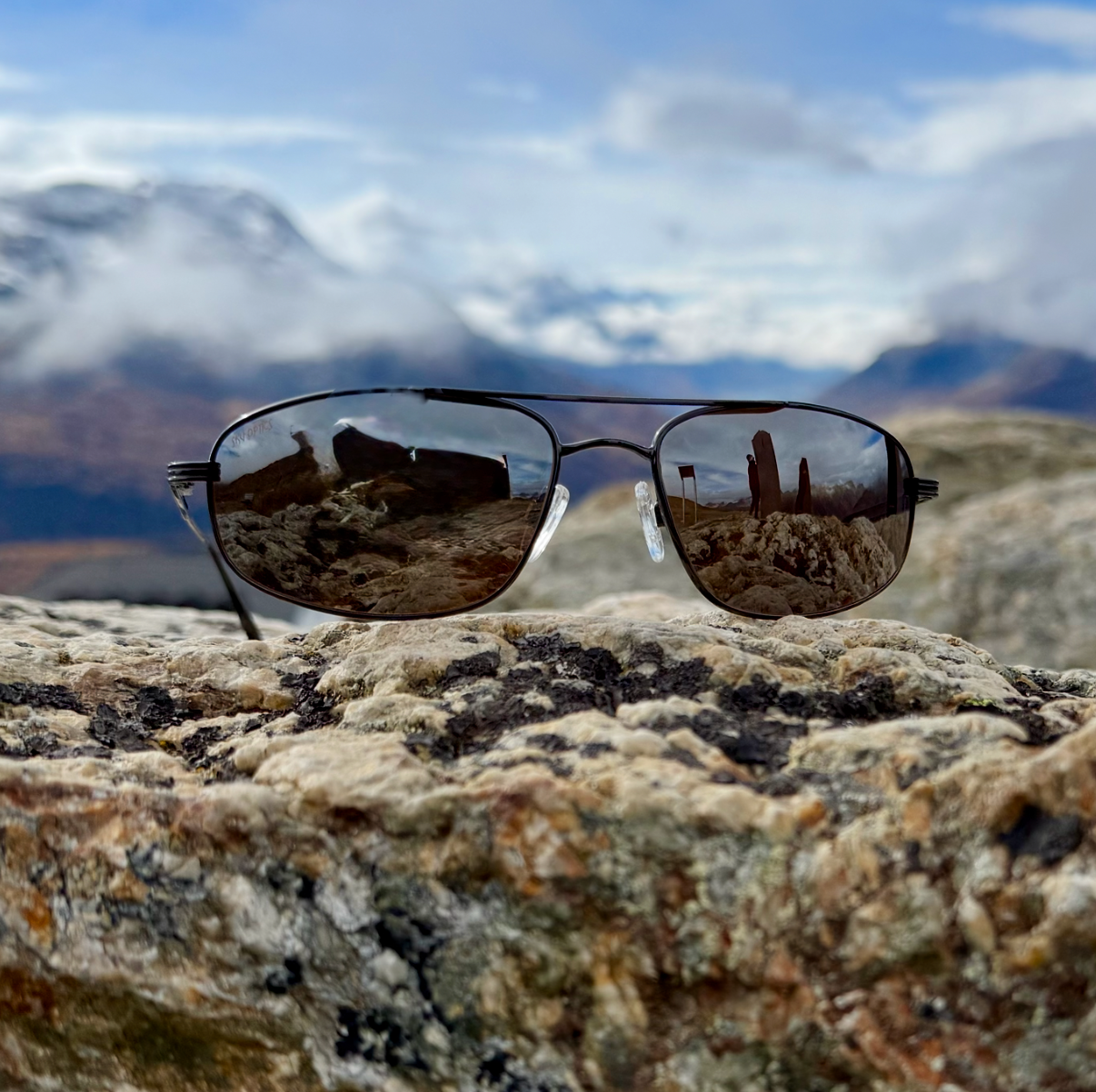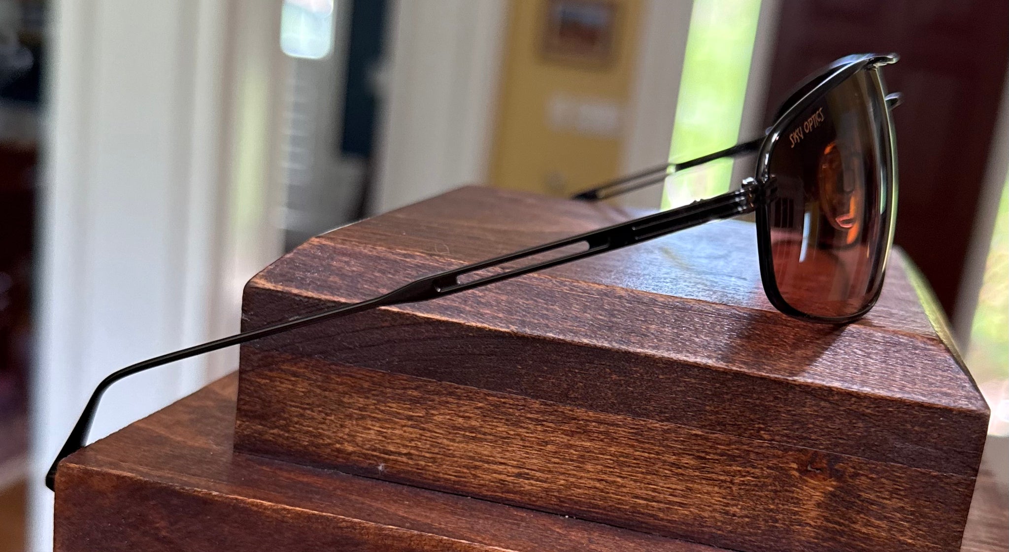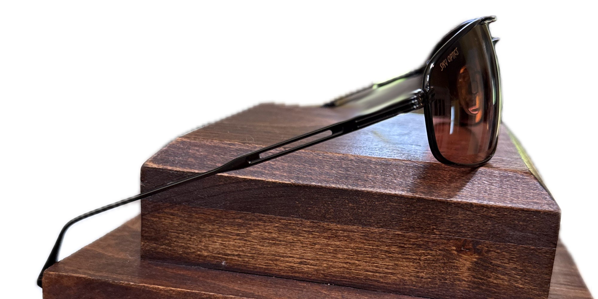 Sky Optics Foil Sunglasses. Light-weight titanium frame with Mineral Glass lenses. Great balance, light on your nose, work great with all Headsets and Helmets. Latest in photochromic technology, which constantly lightens and darkens throughout the day to ensure you see every detail. The Foil will soon be the Most Popular Aviator Sunglasses and is Excellent for Driving.with upgraded soft silicone gel nose pads for a more comfortable fit and better nose grip. Professional Pilots who wear sunglasses most of the day prefer this modification.